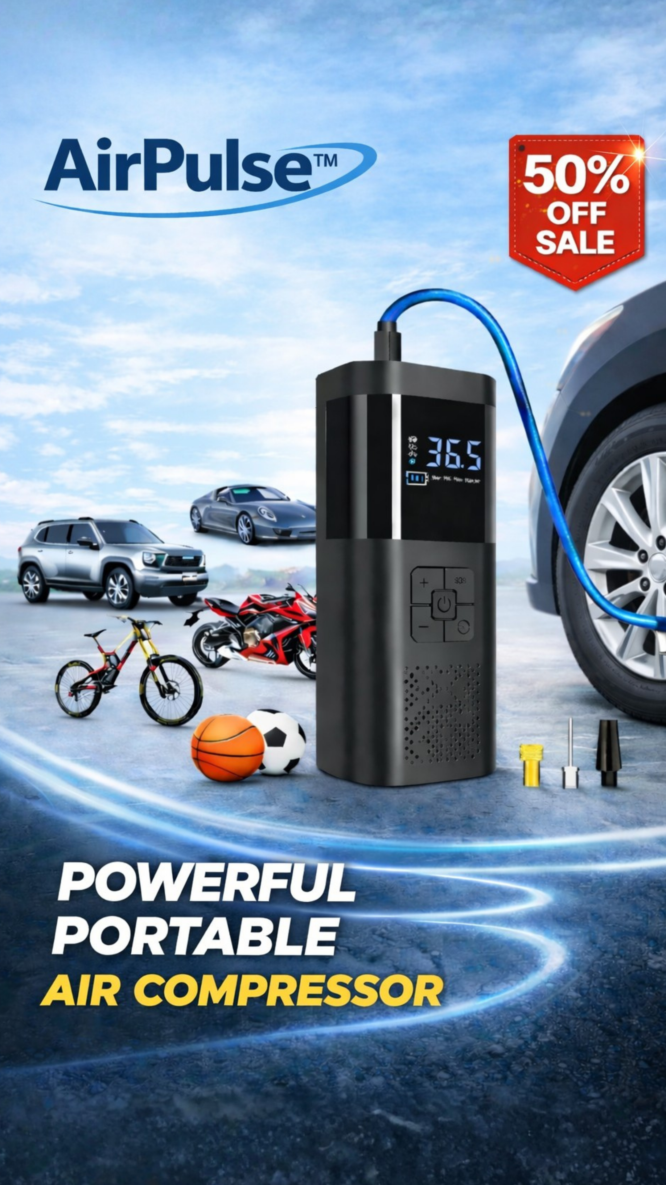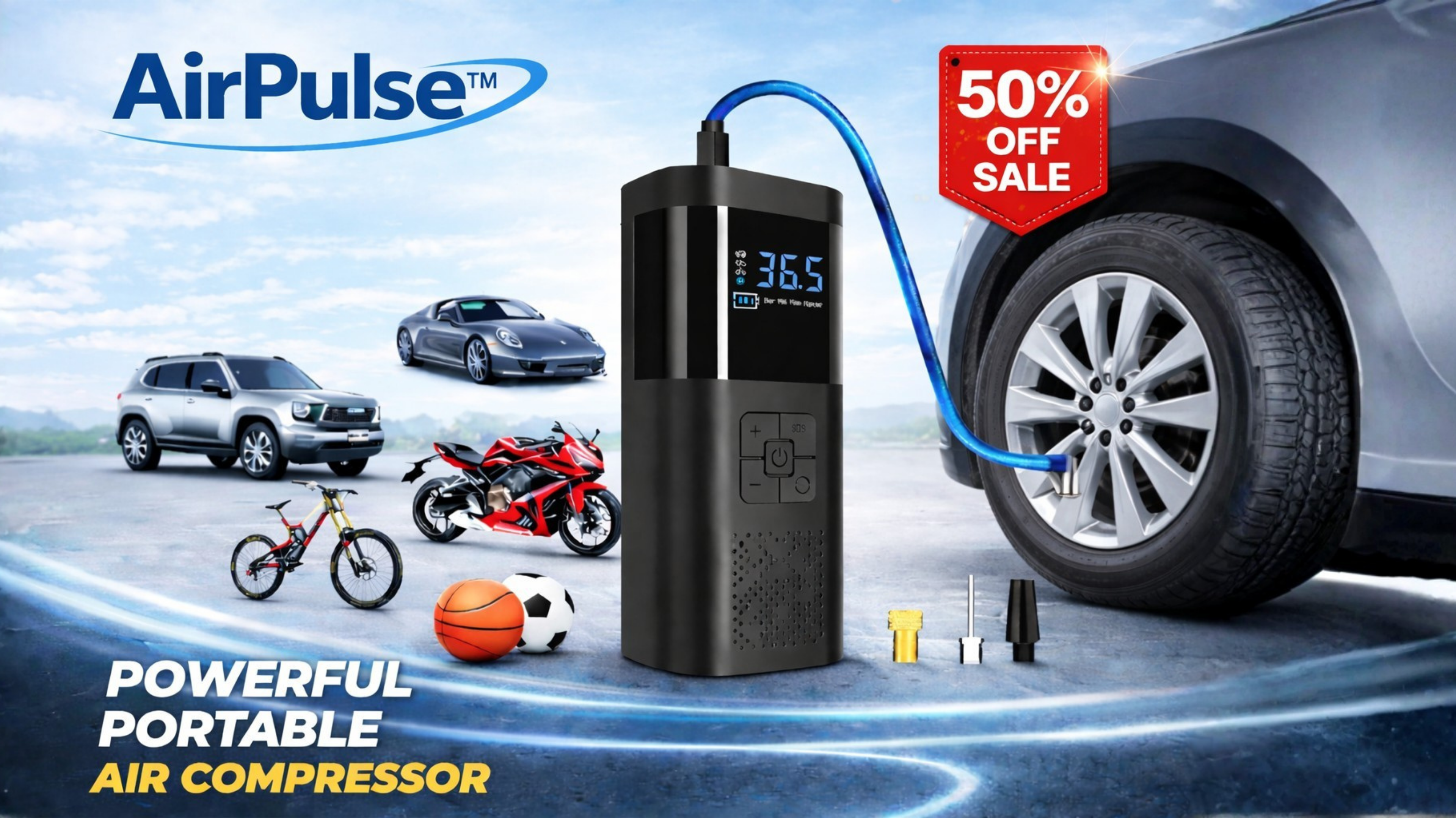 Inflate tyres, bikes, and more without stopping. Charge once. Stay ready.